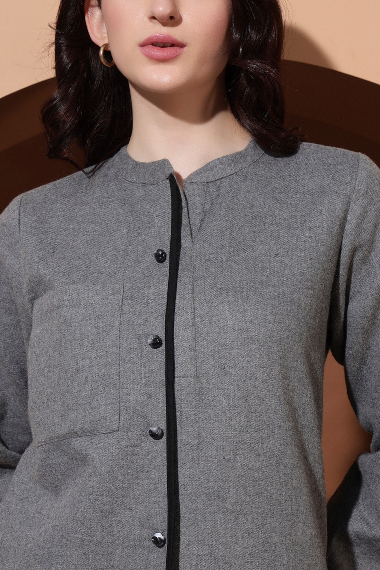Elevate your winter wardrobe with the Ash Aura Co-ord, where comfort meets refined minimalism. Designed in premium terry fabric, this two-piece set features a designer overlap shirt with elegant button detailing and a structured pocket, paired with tailored straight-fit pants for a polished winter silhouette. Soft, warm, and effortlessly chic — this co-ord brings modern sophistication to everyday dressing, making it perfect for casual outings, travel days, or elevated lounge style.