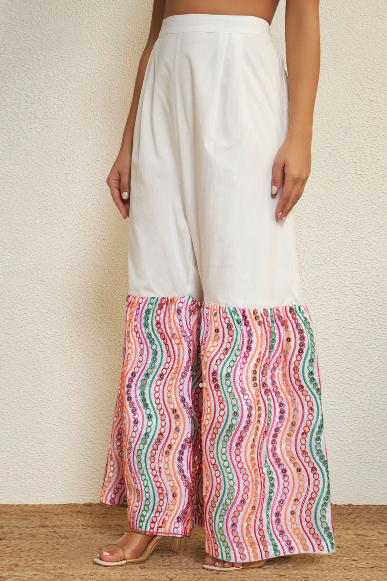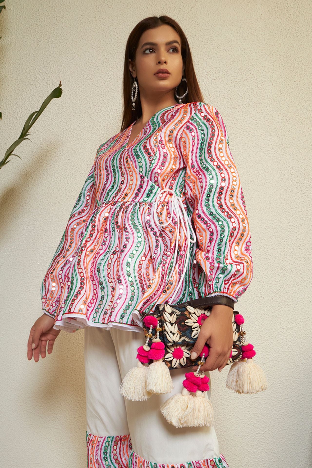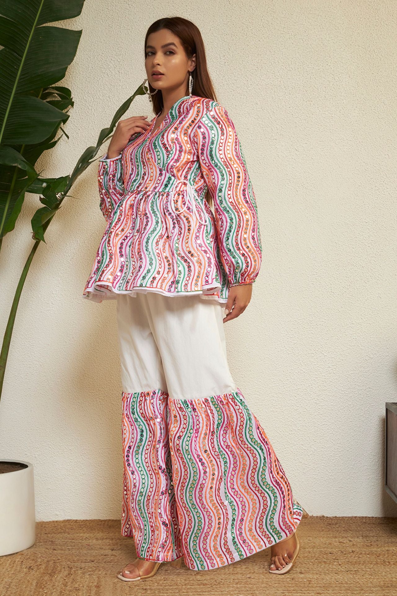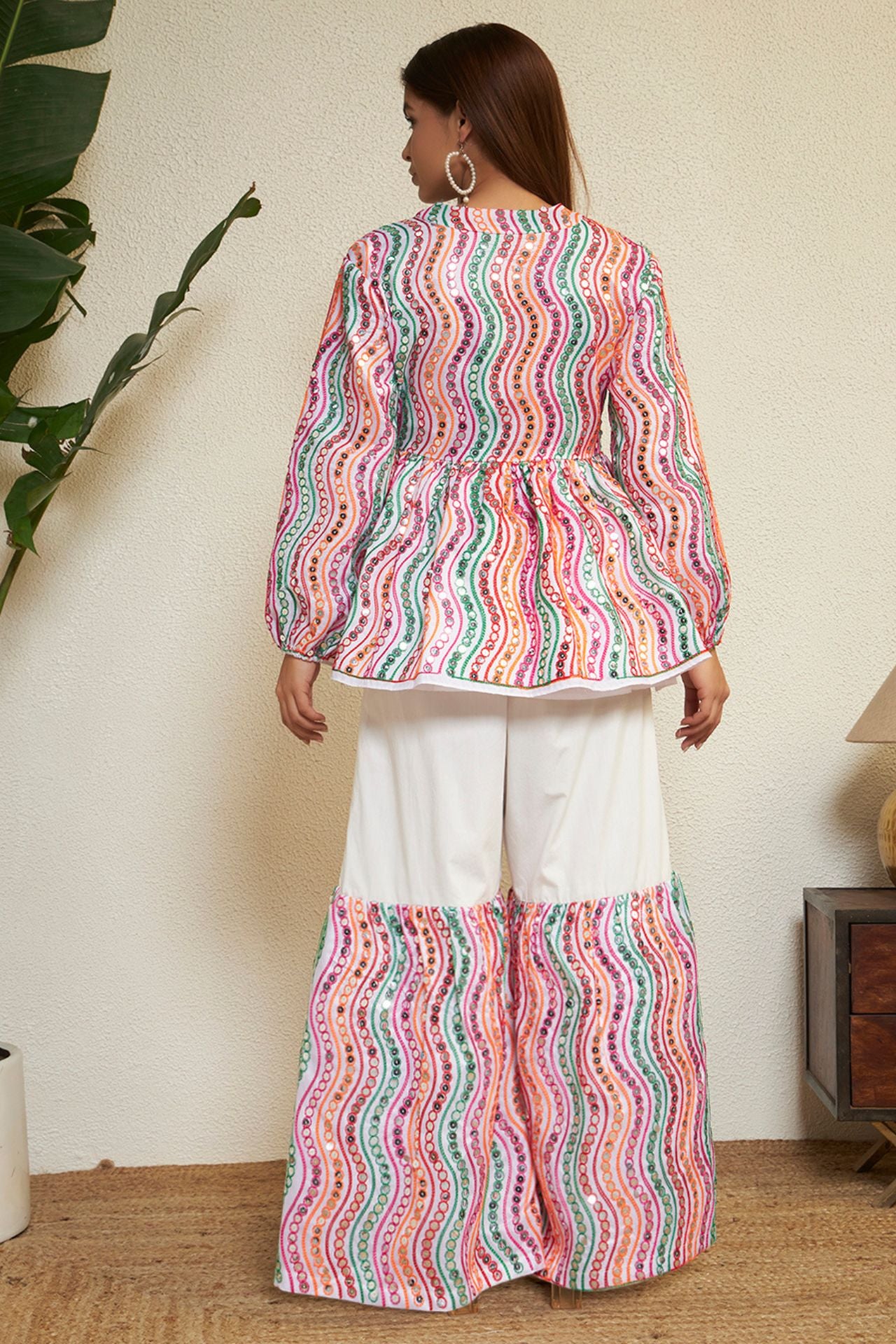 Step into festive elegance with the Navrang Aura Co-ord Set by Prizm Aura, a vibrant ensemble that beautifully captures the spirit of Navratri with a modern twist. Crafted in breathable cotton fabric, this look features a flowy peplum-style top with soft gathers and voluminous sleeves, adorned in lively multicolour wave prints that reflect the essence of nine festive hues. Paired with relaxed wide-leg pants enhanced with coordinated printed panels, the silhouette offers effortless movement and comfort—perfect for Garba nights and festive celebrations. Designed to balance tradition with contemporary charm, this outfit embodies playful femininity with a refined yet striking appeal.
