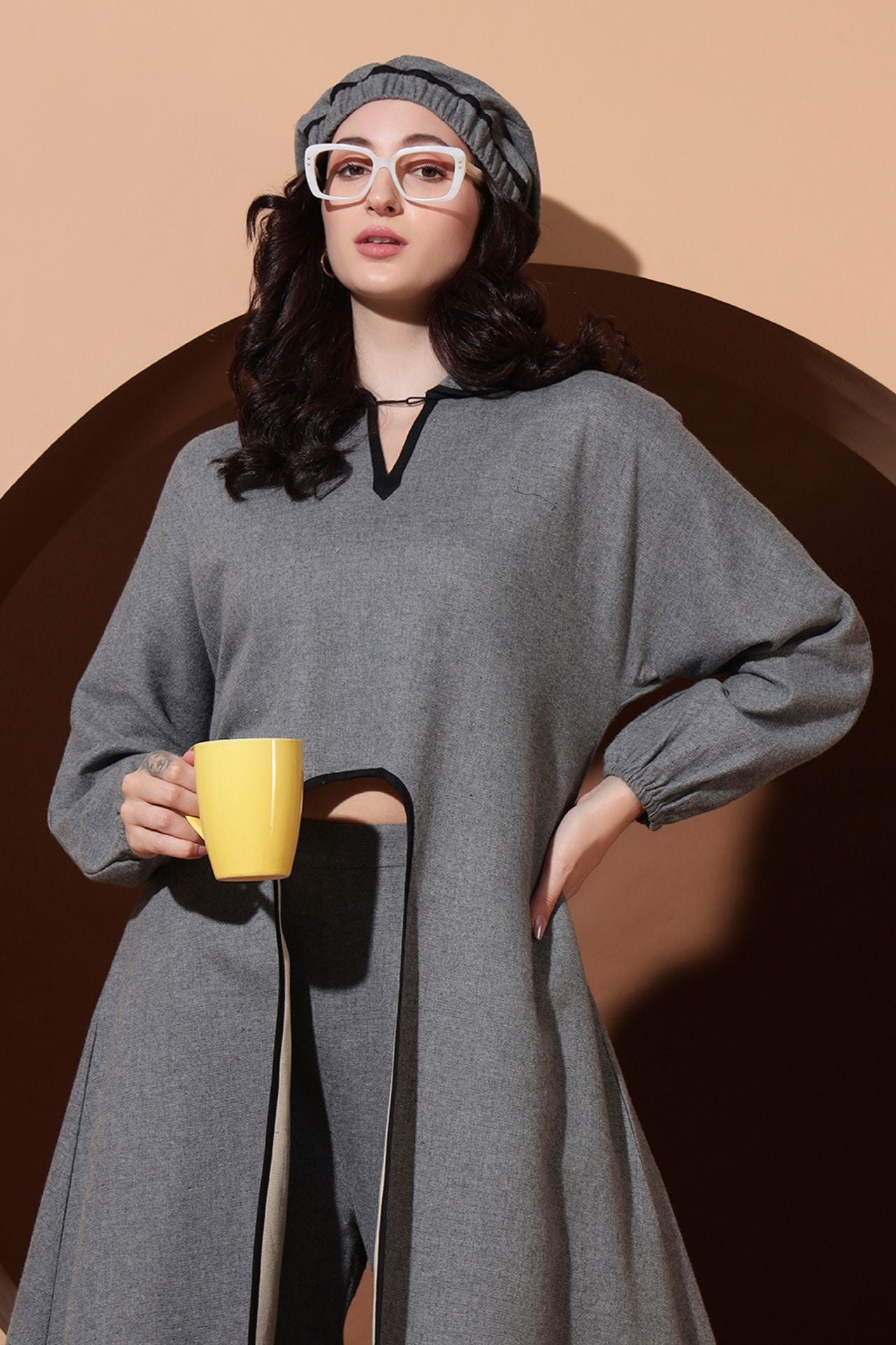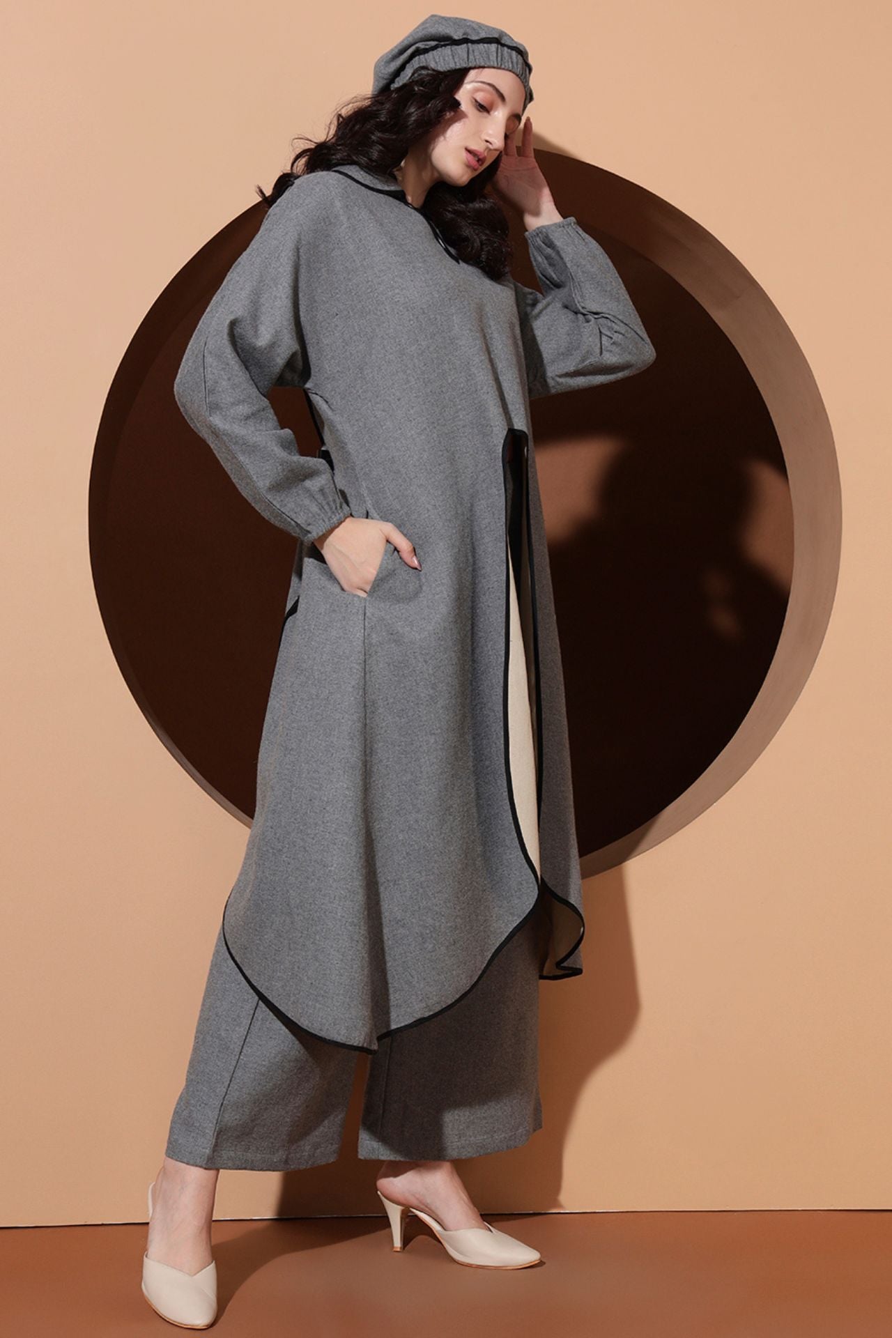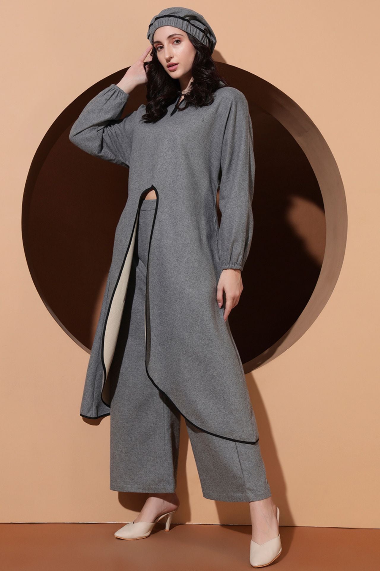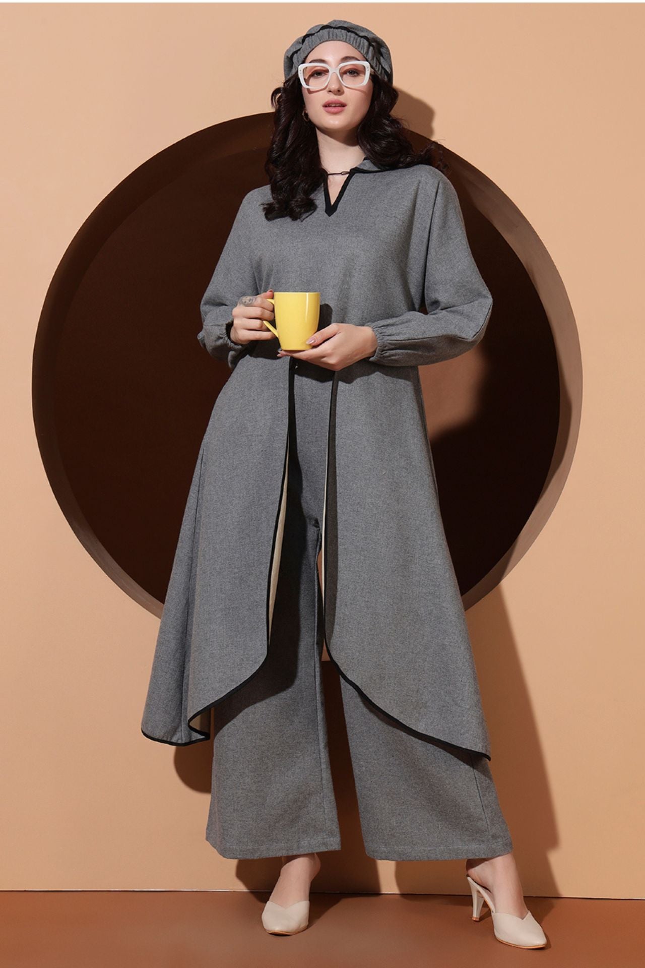 Step into regal sophistication with the Royal Aura Co-ord, a statement winter ensemble crafted for bold, modern elegance. This designer set features a long front-open top with a striking double-collar design, detailed finishing, and dramatic balloon sleeves for a graceful yet powerful silhouette.
