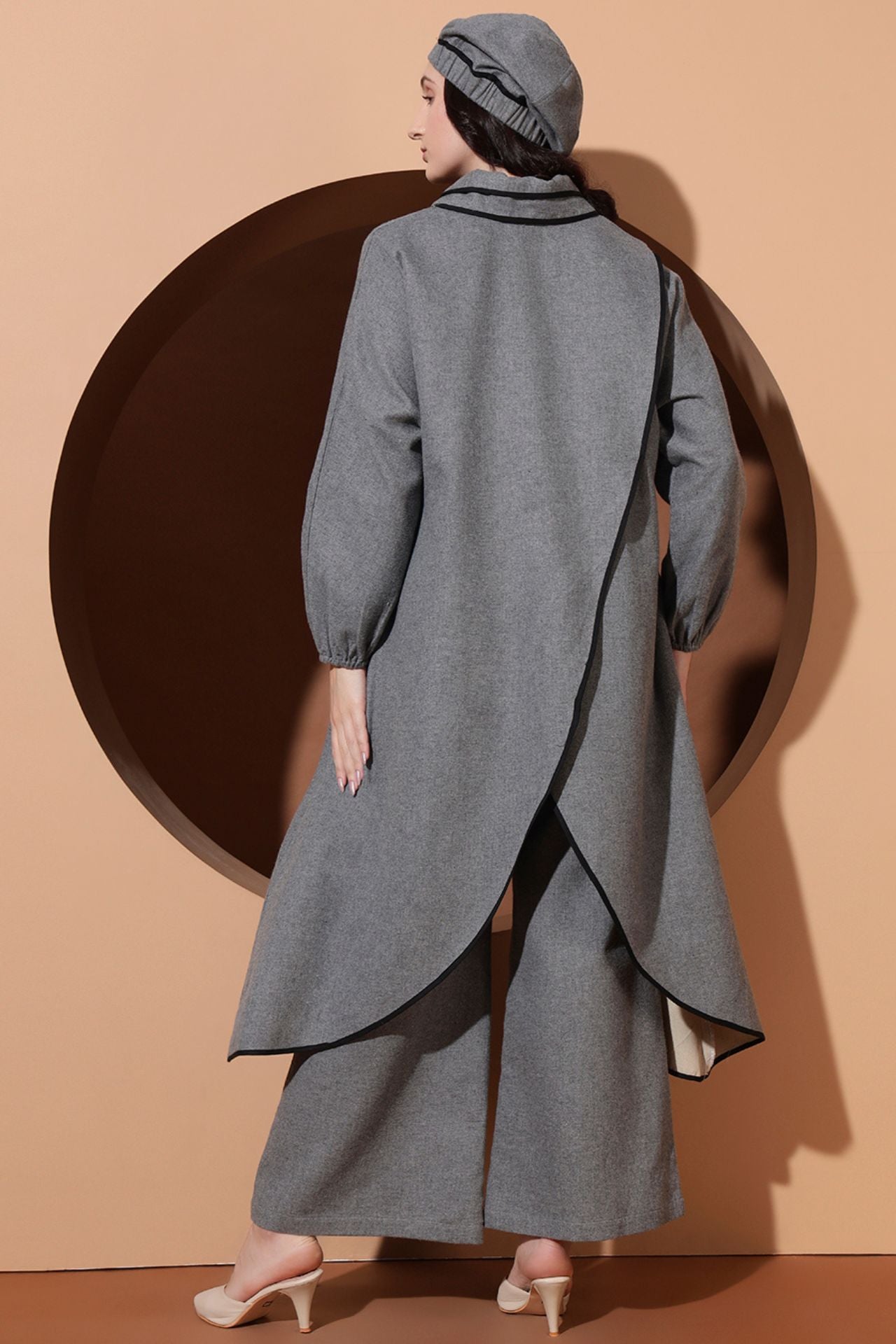 The highlight lies in its back overlap crossed detailing, adding an element of surprise and sculpted structure. Paired with flared pants, this co-ord blends femininity, movement, and poise β perfect for soirΓ©es, premium events, and elevated winter styling.