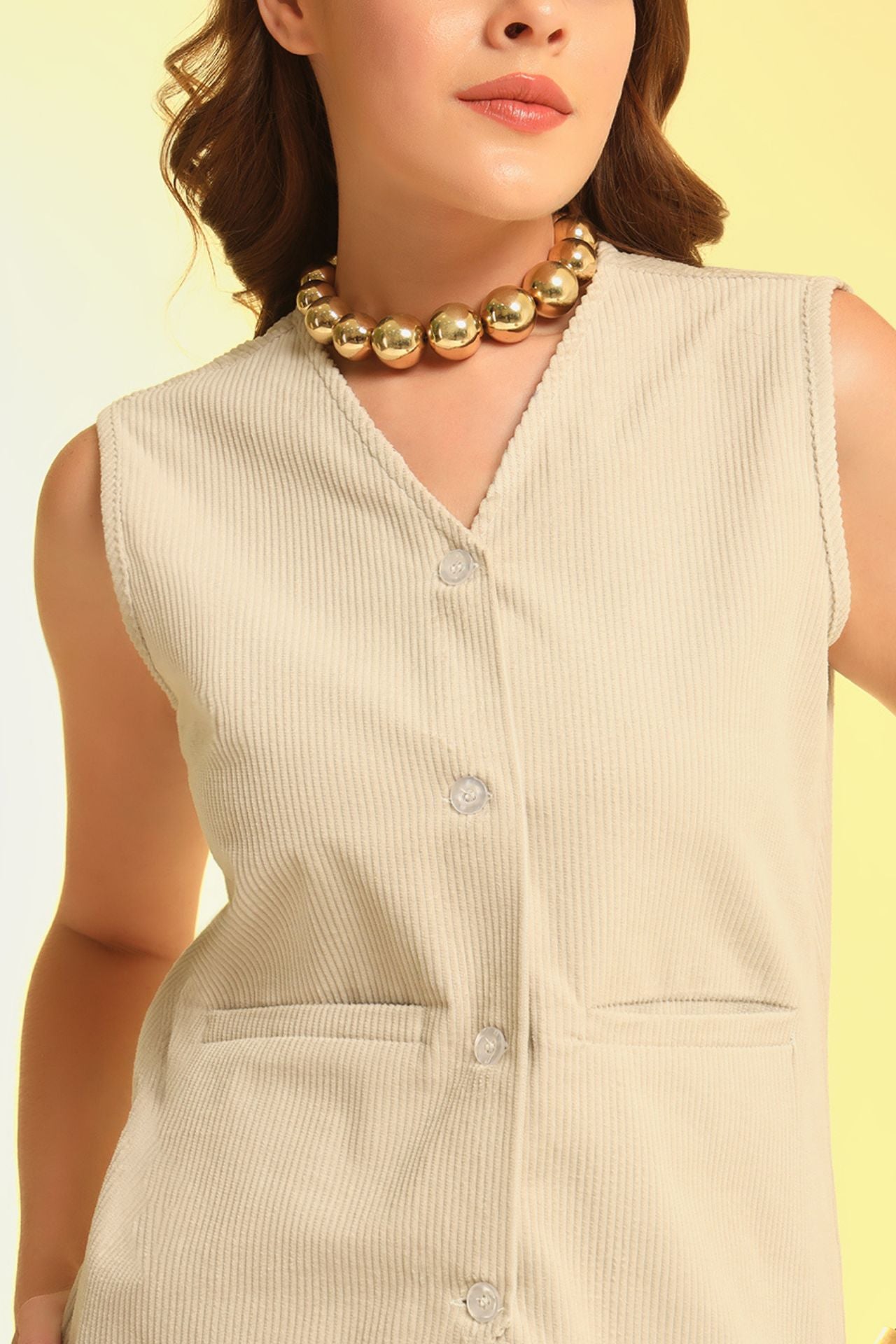 Embrace quiet power dressing with the Sandshell Corduroy Co-ord Set, a modern two-piece ensemble that blends tailored polish with relaxed ease. Featuring a sleeveless jacket with clean front lines and a smart button placket, paired with matching high-waisted pants, this set channels minimalist elegance through the language of texture and tone.